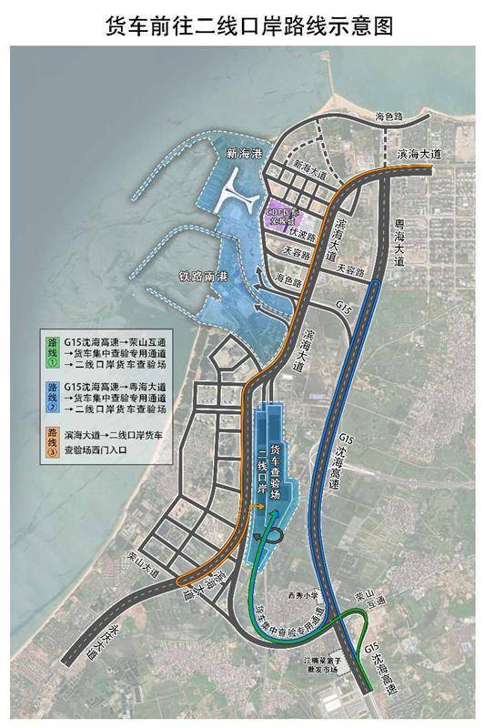 一、2025年9月15日9时起,集中查验场调整为新海港和南港出岛货车的统一出岛通道。请出岛货车司机按照现场标志标识行驶并听从现场工作人员引导,具体路线见《货车前往二线口岸示意图》。后续如有调整,将另行公告。