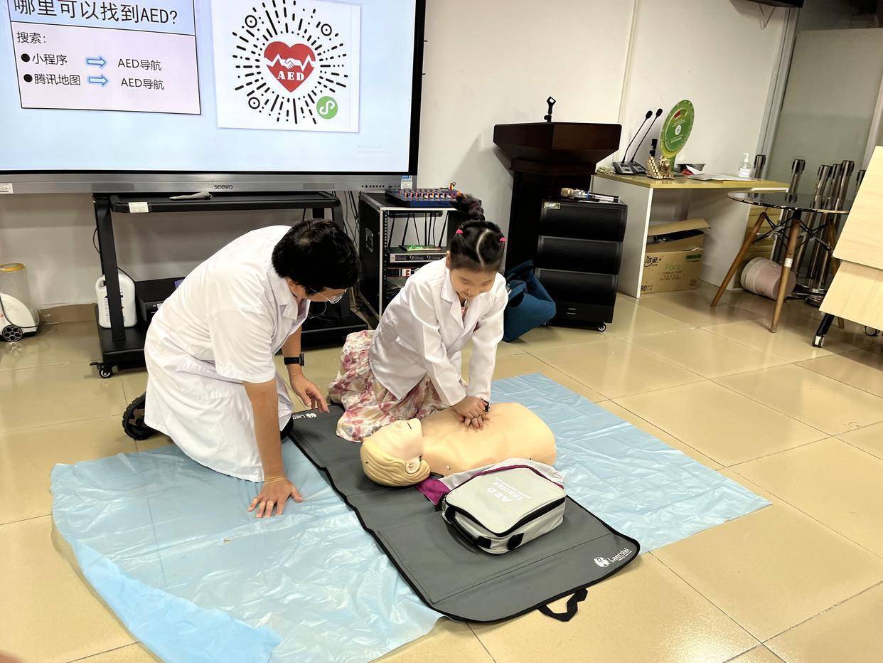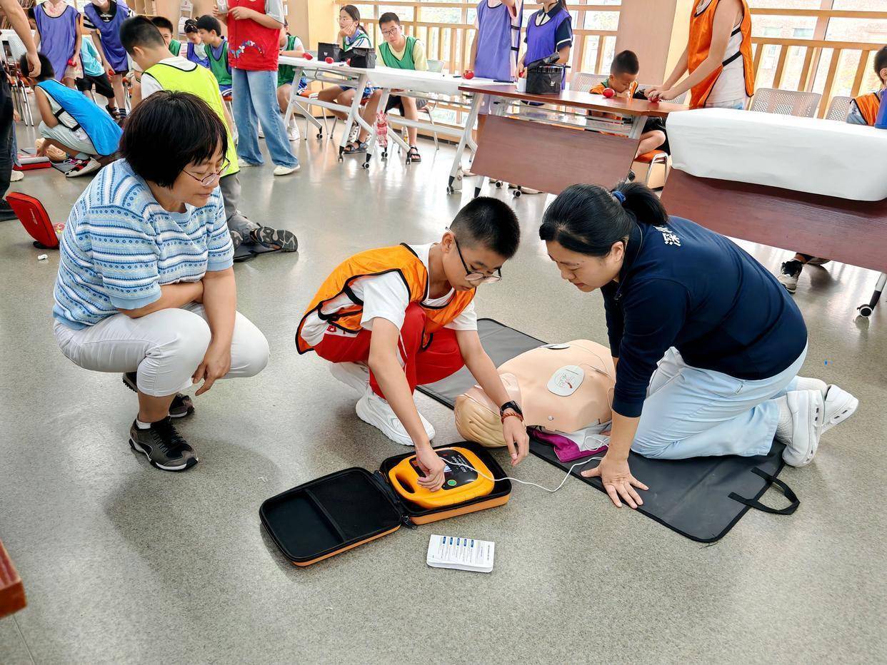 活动分为三期进行。首期以儿童日常安全为核心,系统宣讲了防溺水、交通安全及居家安全等常见安全问题与应对策略。随后开启急救课程,在专业医护人员手把手指导下,孩子们全神贯注地学习并演练了心肺复苏(CPR)操作步骤和AED使用的关键流程,“这次演练让我记住了急救步骤,以后遇到紧急情况也不会慌张了。”小学五年级的李同学激动地说。